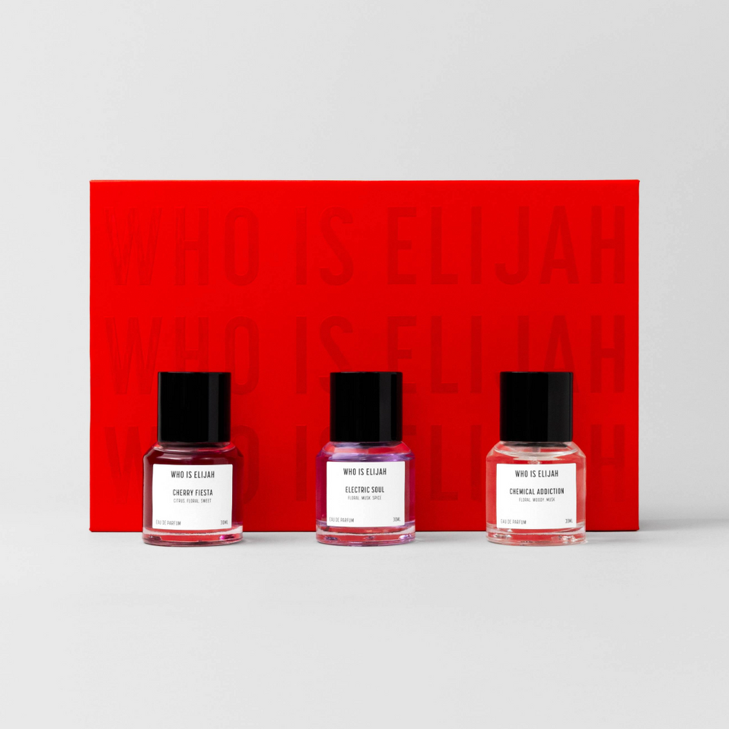 CHERRY FIESTA. ELECTRIC SOUL. CHEMICAL ADDICTION.This limited-edition set includes three of WHO IS ELIJAH’s best-selling scents, CHERRY FIESTA, ELECTRIC SOUL, and CHEMICAL ADDICTION, each in a 30ml bottle. Perfect for gifting or keeping in rotation.