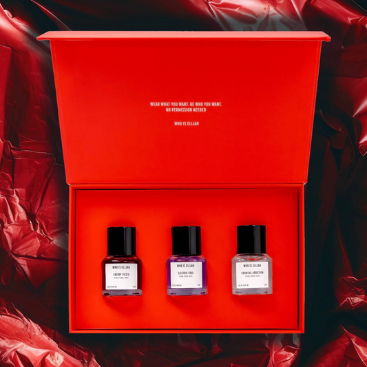 CHERRY FIESTA. ELECTRIC SOUL. CHEMICAL ADDICTION.This limited-edition set includes three of WHO IS ELIJAH’s best-selling scents, CHERRY FIESTA, ELECTRIC SOUL, and CHEMICAL ADDICTION, each in a 30ml bottle. Perfect for gifting or keeping in rotation.